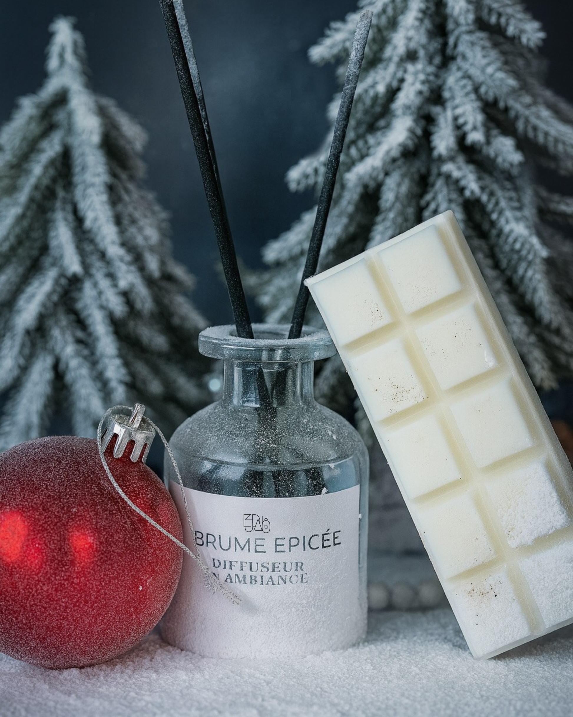 Le coffret comprends une tablette parfumée, un bruleur, 3 bougies chauffe plat, des allumettes ainsi qu'un diffuseur 180ml Brume épicée